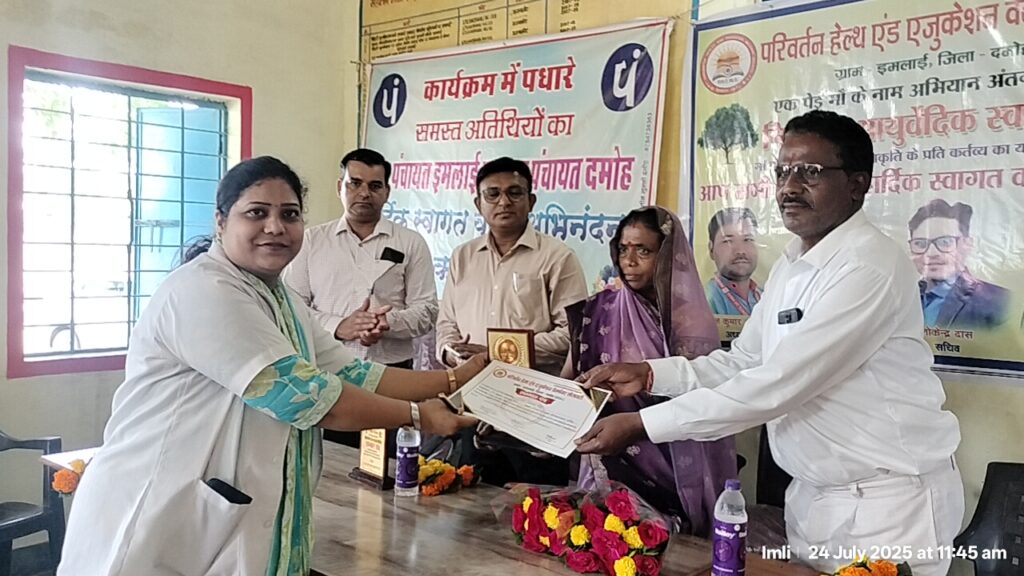 शिविर में शासकीय जिला आयुर्वेद चिकित्सालय पदस्थ आरएमओ डॉ बृजेश कुलपारिया , डॉ. प्रियंका जैन एवं डॉ. अंकिता अहिरवाल द्वारा लगभग 250 मरीजों की स्वास्थ्य जांच की गई। इस दौरान मरीजों के बीपी, शुगर, मौसमी बीमारियां, सर्दी, खांसी, जुकाम, डायरिया आदि की स्क्रीनिंग की गई। शिविर में आये सभी चिकित्सकों को परिवर्तन सोसाइटी द्वारा प्रमाण पत्र एवं स्मृति चिन्ह प्रदान कर सम्मानित किया गया।