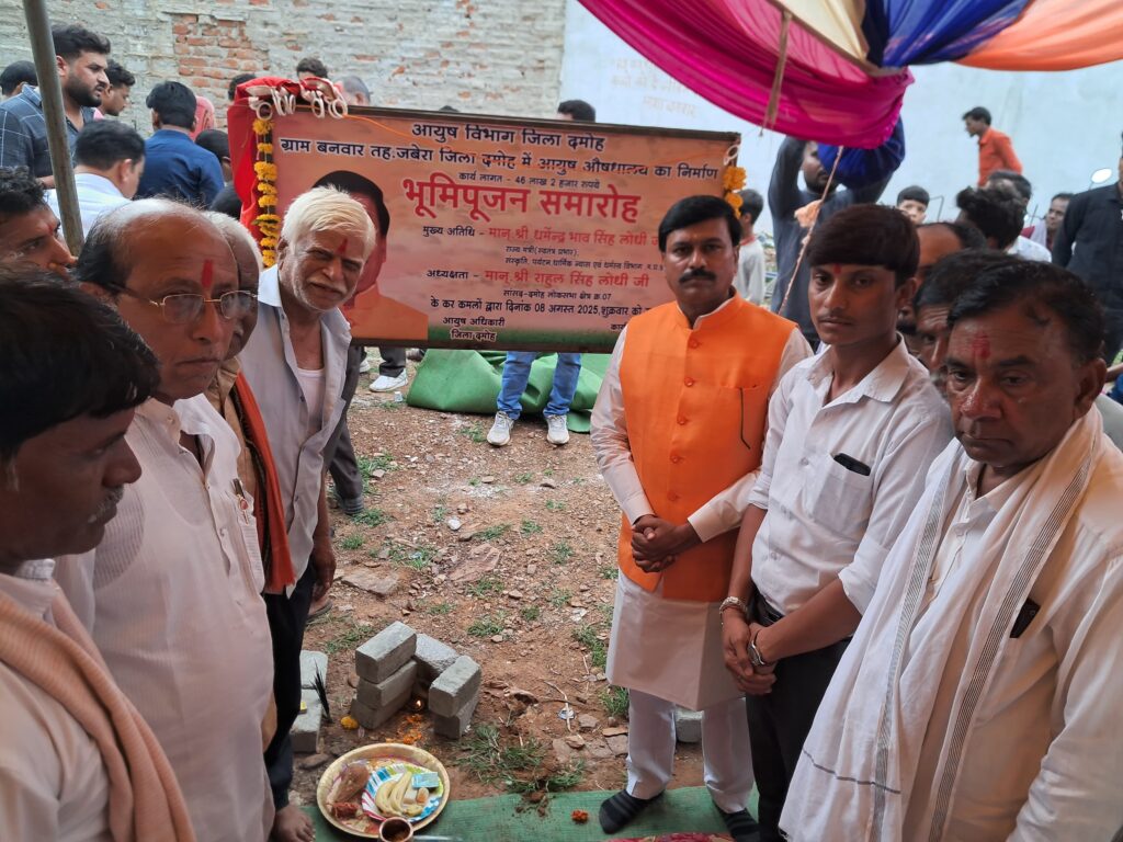 दमोह।जिले की जबेरा विधानसभा क्षेत्र की ग्राम पंचायत बनवार में राज्य मंत्री (स्वतंत्र प्रभार) एवं स्थानीय विधायक धर्मेंद्र सिंह लोधी ने शुक्रवार को 46 लाख रुपये से अधिक की लागत से बनने वाले आयुष औषधालय भवन का भूमि पूजन किया। यह भवन लगभग 10 माह में बनकर तैयार होगा, जिससे ग्रामीणों को पारंपरिक औषधीय उपचार सहित विभिन्न स्वास्थ्य सुविधाएं उपलब्ध होंगी।
