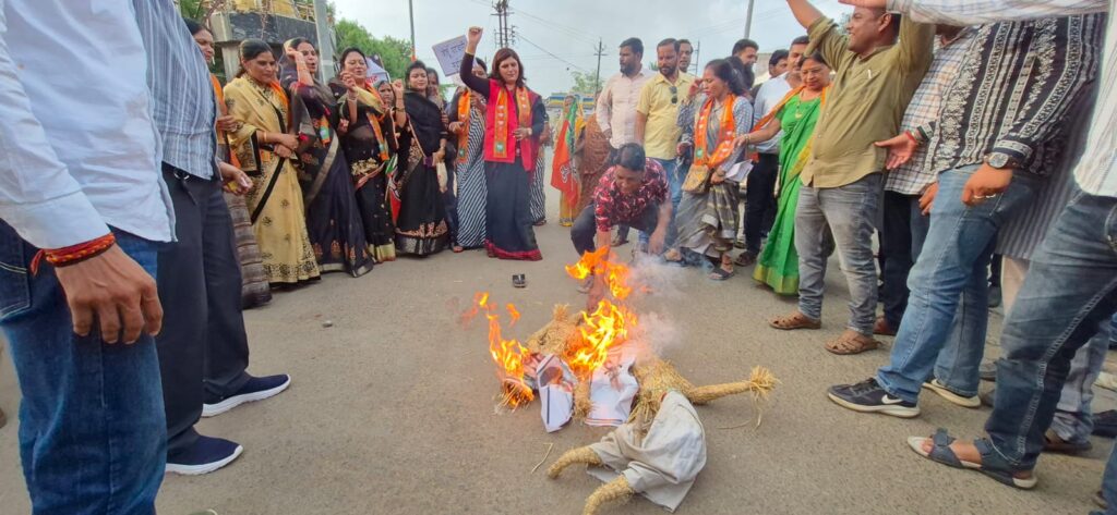 राहुल गांधी और जीतू पटवारी के विवादित बयान के विरोध में भाजपा महिला मोर्चा ने किया पुतला दहन