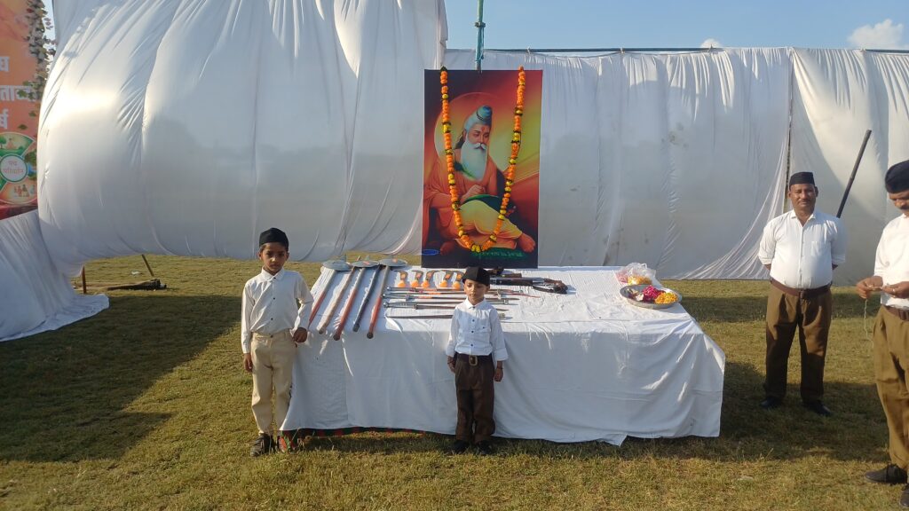 एकत्रीकरण के पश्चात आयोजन की मुख्य अतिथि सिक्ख समाज से इंद्रजीत अरोरा,संघ के सह प्रांत प्रचारक श्रवण जी और जिला सरसंघ चालक डॉ विक्रांत चौहान जी द्वारा सर्वप्रथम शस्त्र पूजन किया गया। शस्त्र पूजन उपरांत मंचिस मुख्य अतिथियों के साथ कार्यक्रम में उपस्थित स्वयंसेवक और उपस्थित जनों द्वारा ध्वज प्रणाम किया गया।