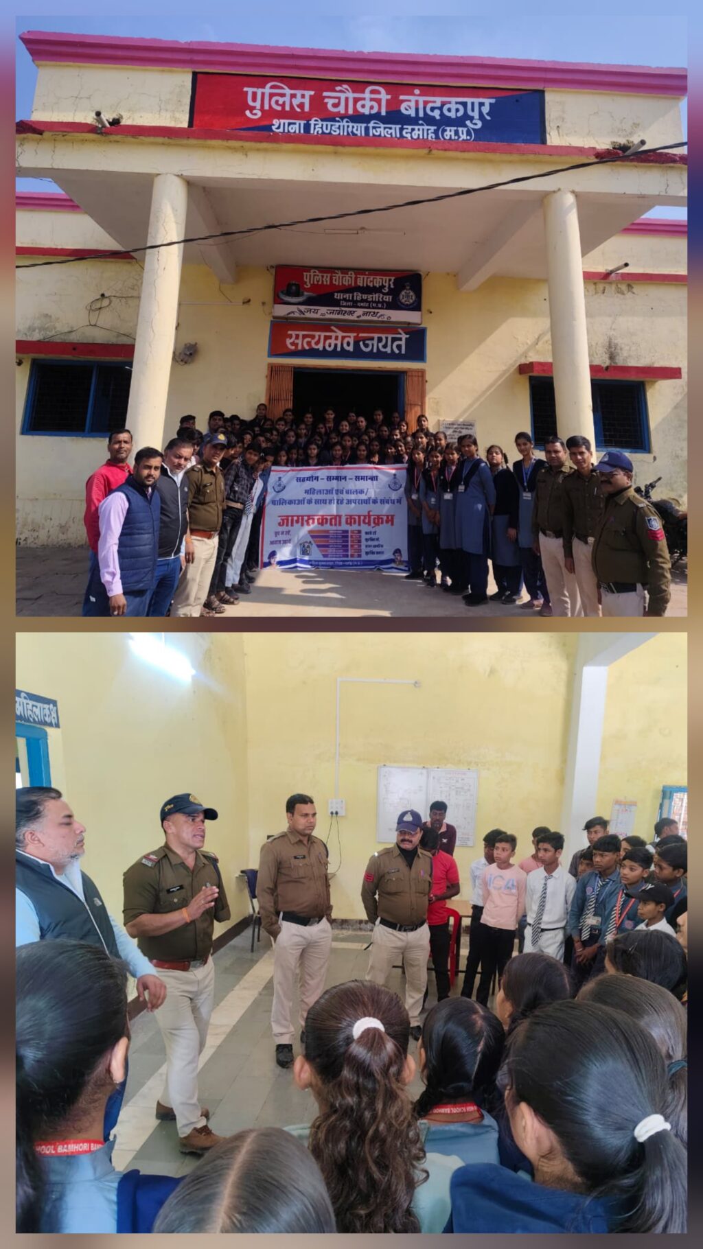 दमोह। पुलिस मुख्यालय भोपाल के निर्देश पर चलाए जा रहे ‘मुस्कान अभियान’ के तहत, दमोह पुलिस लगातार नाबालिगों की सुरक्षा और जागरूकता के लिए कार्यक्रम आयोजित कर रही है। इसी कड़ी में, चौकी बांदकपुर पुलिस द्वारा स्थानीय स्तर पर एक महत्वपूर्ण जागरूकता कार्यक्रम आयोजित किया गया, जिसमें छात्र-छात्राओं और शिक्षकों को महत्वपूर्ण कानूनी और सुरक्षा संबंधी जानकारी दी गई।