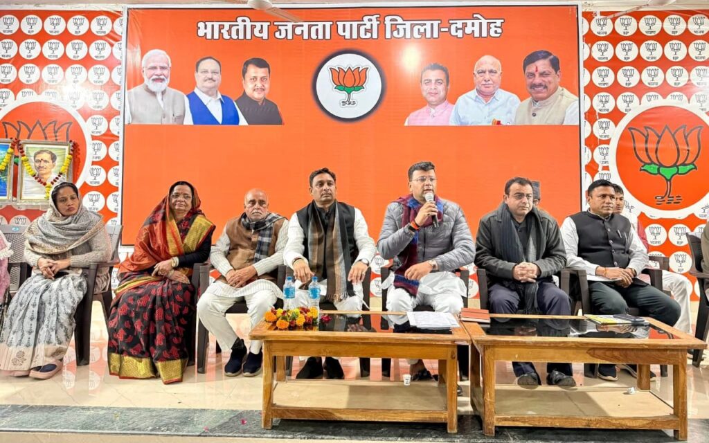 दमोह – भारतीय जनता पार्टी जिला कार्यालय में जिला संगठनात्मक कामकाजी बैठक आयोजित हुई, जिसमें संगठन के आगामी कार्यक्रमों को लेकर चर्चा हुई। बैठक में प्रदेश महामंत्री एवं सागर संभाग प्रभारी गौरव रणदिवे मुख्य रूप से उपस्थित रहे। बैठक की अध्यक्षता जिलाध्यक्ष श्याम शिवहरे ने की। बैठक में दमोह लोकसभा सांसद राहुल सिंह, राज्यमंत्री स्वतंत्र प्रभार धर्मेन्द्र सिंह,हटा विधायक श्रीमती उमा देवी खटीक, बीएलए 1 सिद्धार्थ मलैया, सतेंद्र सिंह, बहादुर पटैल, नरेन्द्र सराफ, जिला पंचायत अध्यक्ष श्रीमती रंजीता पटैल, उपाध्यक्ष श्रीमती मंजू कटारे, पूर्व विधायक पी. एल. तंतुवाय, जिला महामंत्री रामेश्वर चौधरी, अरुण तिवारी, महेश पटैल मंचासीन रहे।