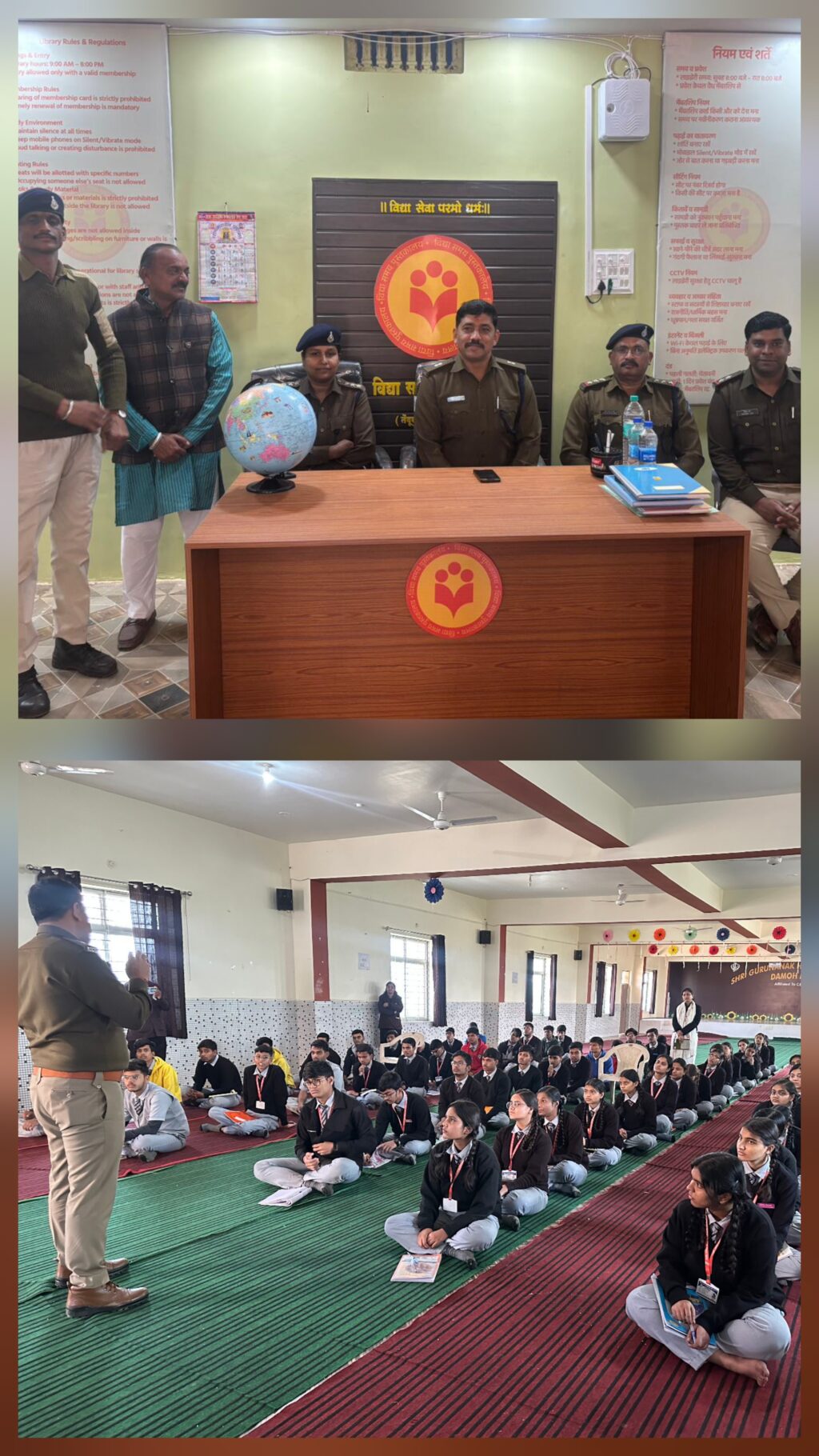 कार्यक्रम के प्रथम सत्र का आयोजन गुरुनानक विद्यालय में किया गया, जिसमें अतिरिक्त पुलिस अधीक्षक, उपनिरीक्षक विकास सिंह (थाना प्रभारी जबेरा), सायबर सेल दमोह से प्रधान आरक्षक सौरभ टण्डन एवं राकेश आठ्या उपस्थित रहे। इस दौरान विद्यार्थियों को प्रोजेक्टर के माध्यम से प्रशिक्षण प्रदान किया गया।