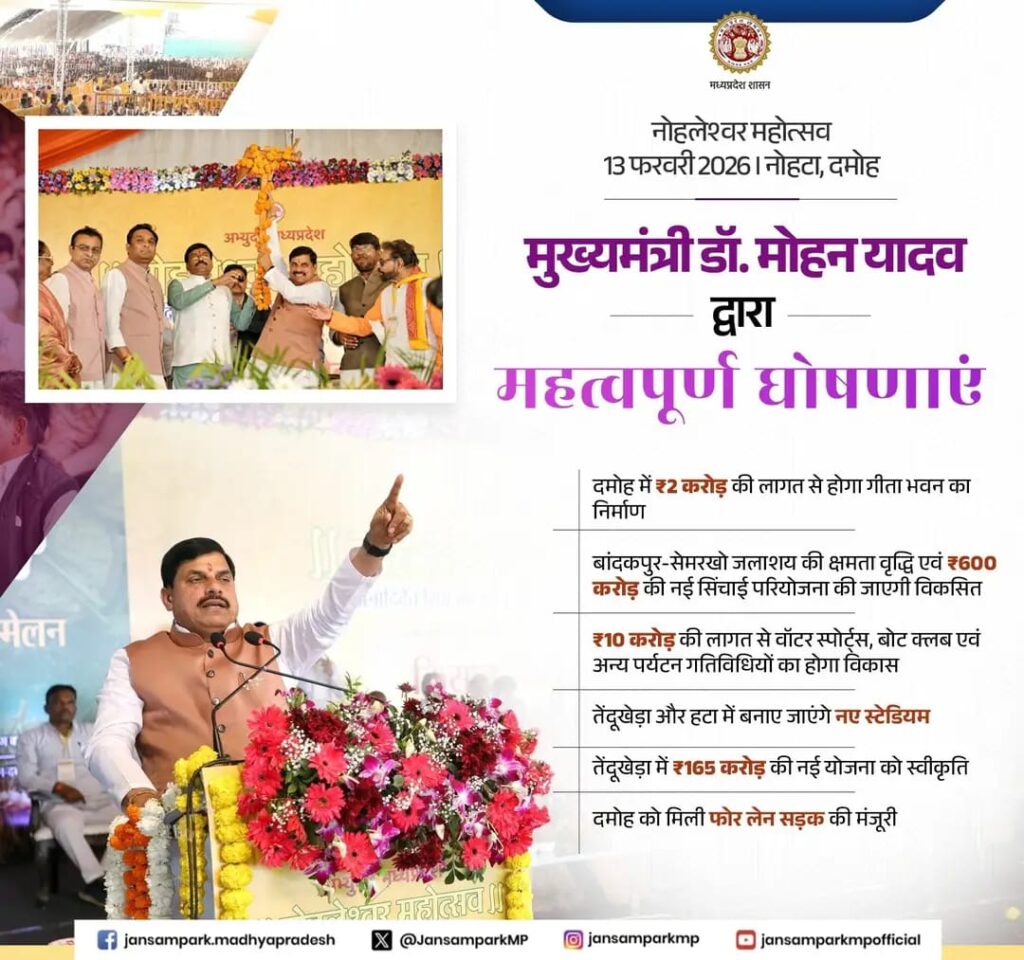 किसान सम्मेलन में मुख्यमंत्री डॉ. यादव ने क्षेत्रीय जनता की मांग पर नोहटा को परीक्षण के उपरांत नगर परिषद बनाने की घोषणा की। मुख्यमंत्री ने कहा कि दमोह में 2 करोड़ रूपए की लागत से गीता भवन का निर्माण किया जाएगा। दमोह जिले में बांदकपुर-सेमरखो जलाशय की क्षमता में वृद्धि कर 600 करोड़ रूपए की नई सिंचाई परियोजना विकसित की जाएगी। इससे जिले के 33 गांवों को भरपूर पानी मिलेगा। दमोह में 10 करोड़ रूपए की लागत से वॉटर स्पोर्ट्स, बोट क्लब सहित अन्य पर्यटन गतिविधियों का विकास किया जाएगा। मुख्यमंत्री ने कहा कि तेंदूखेड़ा और हटा में खेल गतिविधियों के प्रोत्साहन के लिए नए स्टेडियम बनाए जाएंगे। इस मौके पर मुख्यमंत्री ने सुप्रसिद्ध भजन गायिका सुश्री शहनाज अख्तर का अभिनंदन भी किया।