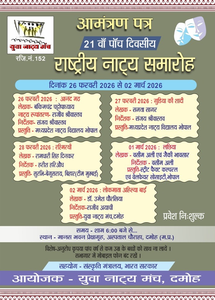 दमोह। संस्कृति मंत्रालय भारत सरकार के सहयोग से युवा नाटक मंच के द्वारा 21वें राष्ट्रीय नाट्य समारोह का आयोजन 26 फरवरी 2026 दिन गुरुवार से नगर के अस्पताल चौक स्थित मानस भवन में किया जा रहा है। इस वर्ष नाट्य समारोह पांच दिवसीय होगा जिसमें प्रत्येक दिन अलग-अलग रंग संस्था द्वारा नाटकों की प्रस्तुतियां दी जाएंगी।