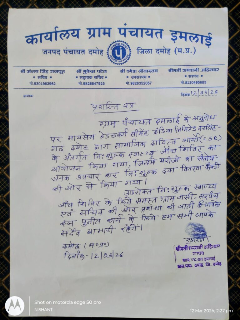 ग्राम पंचायत इमलई की सरपंच श्रीमती रामरानी अहिरवार, सचिव संजय सिंह राजपूत, सहायक सचिव मुकेश पटेल और उपसरपंच रमेश श्रीवास्तव सहित ग्राम के जनप्रतिनिधियों एवं ग्रामीणों ने इस पहल के लिए मायसेम हीडलबर्ग सीमेंट प्रबंधन और मेडिकल टीम का आभार व्यक्त किया।